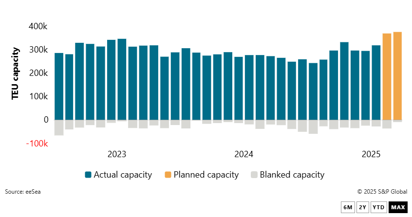同时,数据显示,9月份欧洲北部至美国东海岸航线的运力计划将增加至376,132 TEU,比8月份增长2%,而通过停航撤出的运力仅有7,349 TEU。该数据来自运价基准平台Xeneta。