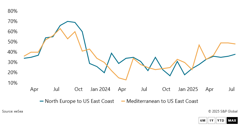 Xeneta 的 Ozuygur 也认同托运人普遍采取观望态度,并指出,在贸易协议达成后,跨大西洋市场的稳定性和积极性已明显好于之前的高度波动期。