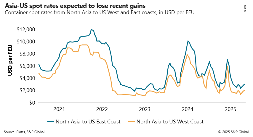 根据标普全球旗下的Platts数据,这次GRI将西岸即期运价推高至每FEU约 2,750–2,850美元,而一周前的价位约为 2,040美元。