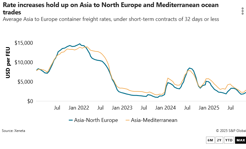 亚欧短约自 10 月 1 日以来上涨超过 20%,本周达到 2,349 美元/FEU
