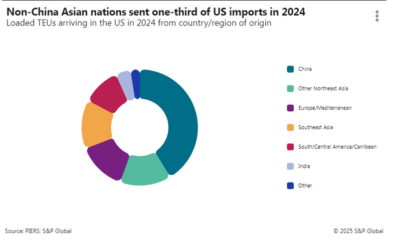 The US West Coast (USWC) will feel these changes more acutely than the East or Gulf coasts. Over 57% of the USWC import TEUs in 2024 arrived from China, while they composed “only” 25% of the East Coast’s volume, with the Gulf Coast in between at 35%.