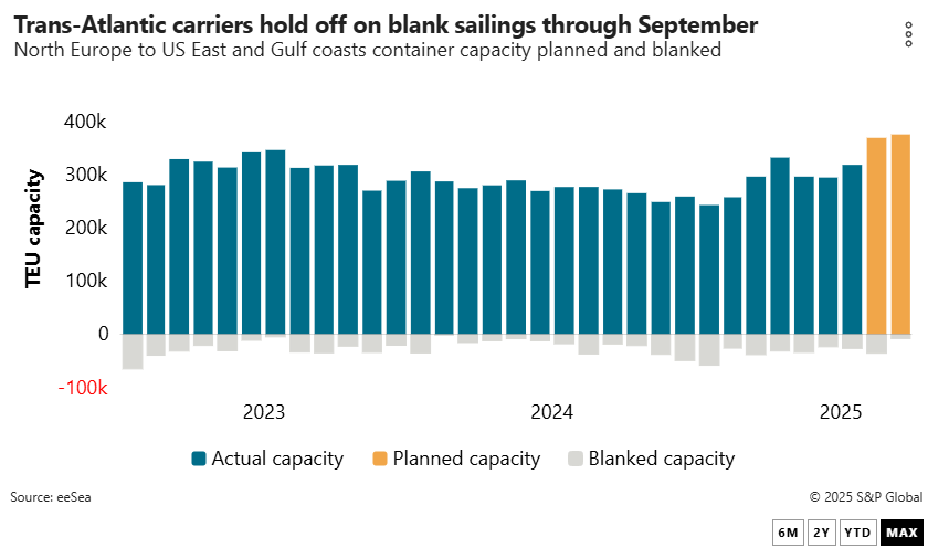 While carriers on the North Europe-US East Coast route are scheduled to increase deployed capacity to 376,132 TEUs in September, up 2% compared with August, just 7,349 TEUs in capacity will be withdrawn via blank sailings, according to data from rate benchmarking platform Xeneta.