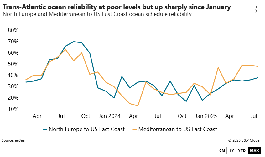 The schedule reliability and capacity deployed through the rest of the year will likely depend on how demand shapes up in the new trans-Atlantic tariff landscape.