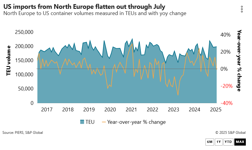 Frontloading in June as US-EU trade tensions escalated saw North Europe to US East Coast volume grow 14.2% year over year to almost 200,000 TEUs, according to PIERS, a sister product of the Journal of Commerce within S&P Global. It was short-lived, however, with July volume sliding to 198,750 TEUs.