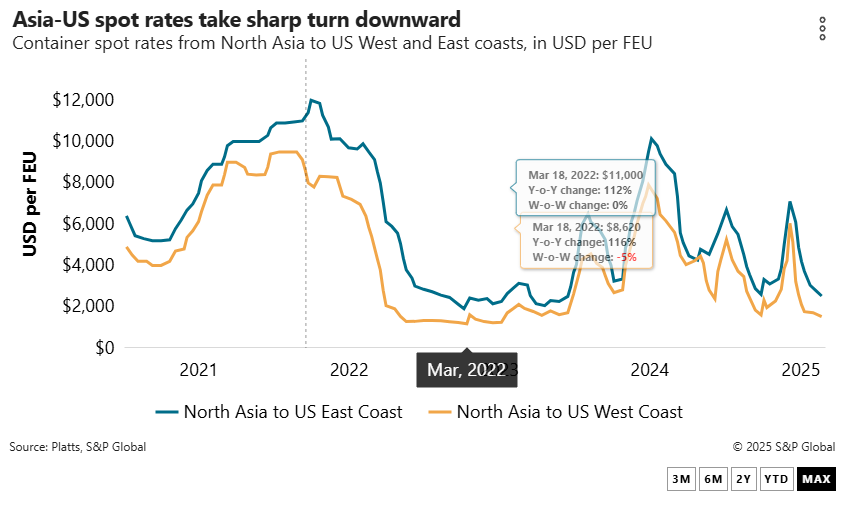 Spot rates are certainly feeling the effects of weakening demand and excess capacity. Asia-US West Coast spot rates at $1,640 per FEU are one-third of the price at the beginning of January, according to Platts, a sister company of the Journal of Commerce within S&P Global. On Asia-North Europe routes, rates are half of what they were on Jan. 1, while on the trans-Atlantic westbound trade, spot prices have been at loss-making levels for weeks.