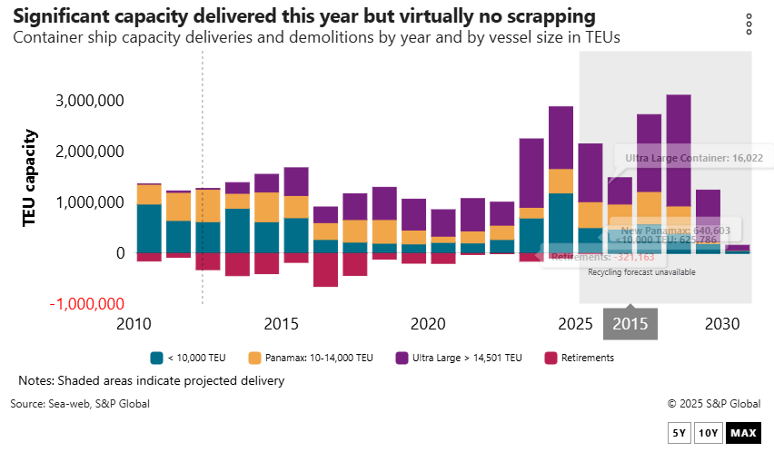 At the same time, capacity is steadily increasing. The global order book is now 9.3 million TEUs, or 29% of the in-service fleet, according to Alphaliner. About 1.8 million TEUs of capacity are set to be delivered this year, with another 1.6 million TEUs coming online in 2026, according to Drewry.