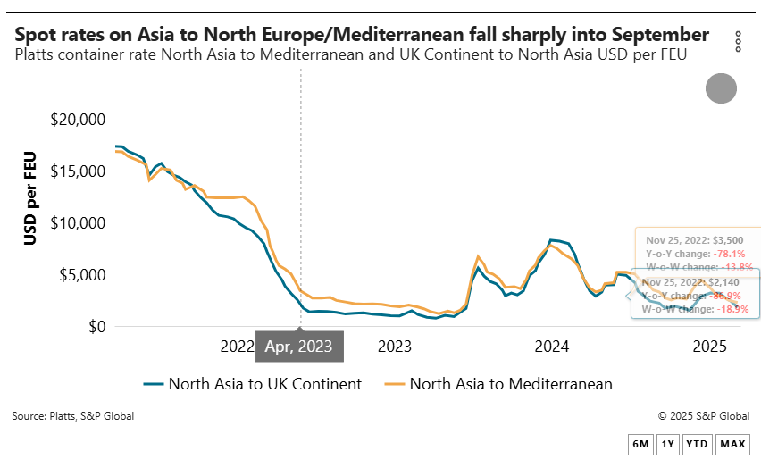 “We’re seeing Asia-North Europe spot rates falling at an accelerated pace, while Mediterranean rates are declining more slowly, eliminating the traditional price differential between these destinations,” the forwarder noted.