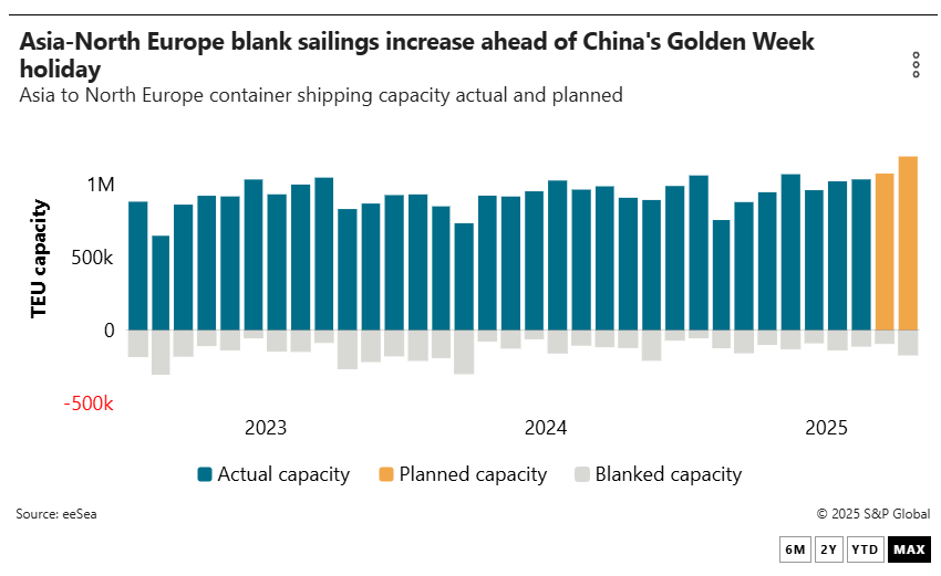 Despite reports of full ships from carriers, the frontloading that led to an early peak season on the Asia-Europe trade is expected to curb demand through the last quarter, with blank sailings announcements picking up ahead of China’s National Day Golden Week holiday that begins on Oct. 1.