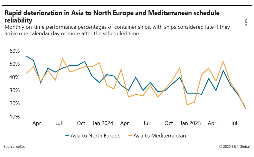 In tandem with the rate decline is schedule reliability that in August fell to its lowest level in years. Data from eeSea shows on-time performance on Asia-North Europe of just 17% and 16% from Asia to the Mediterranean.