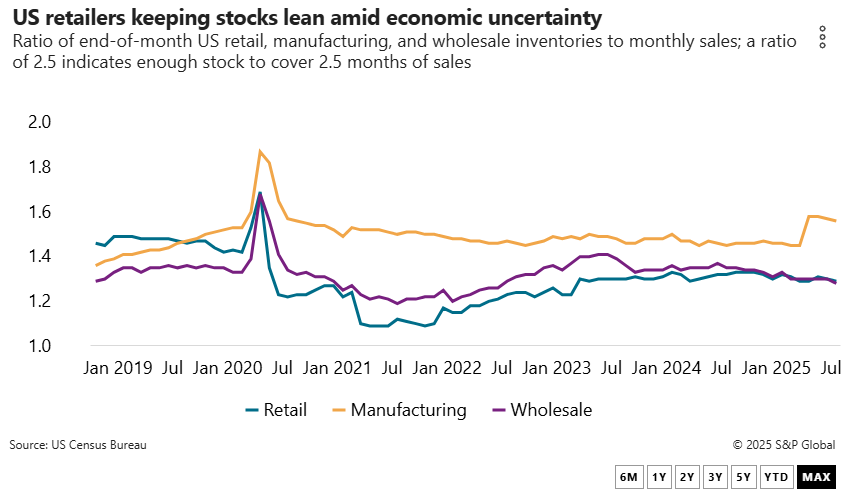 It’s not surprising then that retailers are making sure they have just enough product on hand. US inventory-to-retail sales ratios for retailers have hovered between 1.28 and 1.32, according to the US Bureau of Economic Analysis, suggesting that despite the frontloading of imports in the first half of the year, stocks remain lean. Retailers appear to be extending that strategy into the new year; the GPT report forecasts imports will fall 12.2% year over year to 5.62 million TEUs in the first quarter of 2026.