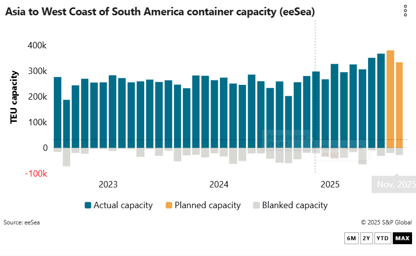 Actual capacity deployed on Asia-WCSA in December is 370,825 TEUs, up from 234,935 TEUs a year ago, according to eeSea data displayed on the Journal of Commerce’s Gateway platform. Similarly, actual capacity on Asia-ECSA services for December rose to 299,490 TEUs, up from 191,429 TEUs in December 2024, the eeSea data showed.