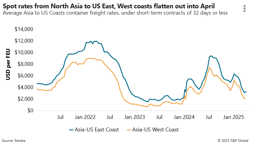 The wait-and-see approach from US importers on the eastbound trans-Pacific has as yet not caused any significant movement among various spot rate indexes. Data from rate benchmarking platform Xeneta shows average spot rates from China to the US West Coast at $2,886 per FEU as of Thursday, essentially flat since a general rate increase April 1. The Asia-US East Coast rate has also been flat since April 1 at $3,861/FEU.